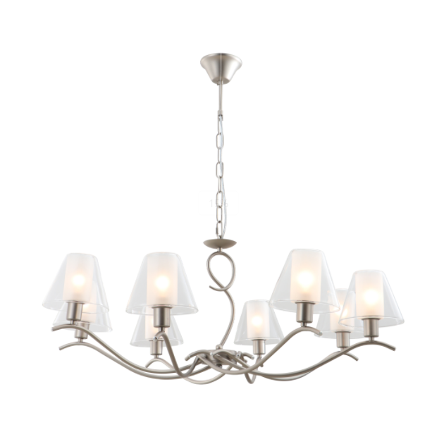Deze 8-lichts kroonluchter met dubbele glazen met satijnen nikkelafwerking toont een harmonieuze mix van vorm en functie. De conische buitenste glazen tinten creëren een opvallend geometrisch silhouet, terwijl de matte binnencilinders de lichtoutput verzachten, waardoor glans wordt geëlimineerd. De nikkelafwerking van het satijnen zand voegt een gedempte metalen glans toe, die zowel neutrale als gewaagde kleurenschema's aanvult. Zachte bochten in de vertakte armen verbeteren de visuele stroom, waardoor het een centraal punt in moderne interieurs is.