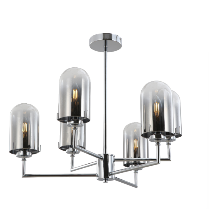 Het koepelvormige rookgrijs glas is gemaakt met vacuüm elektropatise technologie, met een grijs-getinten doorzichtig ontwerp dat zacht en anti-glare is. Sterke verlichting populair ontwerp chroom metaal rokerige koepel glazen hanglamp ondersteunt een mix van 6 E14-lampvakken voor LED- en energiebesparende lampen, waarbij elke lamp tot 20 vierkante meter ruimte bedekt.