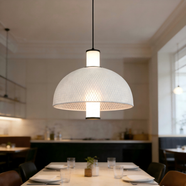 Geïnspireerd door de allernieuwste designtrends op de Milanese Euroluce-tentoonstelling van 2025, combineert deze minimalistische hanglamp van Italiaans zijden gaas van Strong Lighting naadloos Italiaans minimalisme met praktische functionaliteit. De centrale LED-lichtbron van 15W straalt 4000K neutraal licht uit, waardoor een comfortabele sfeer ontstaat. Met een helderheid van 1500LM en een hoge kleurweergave-index van Ra>80 is het licht natuurlijk en levensecht, waardoor het geschikt is voor woonkamers, eetkamers en andere ruimtes. De ronde boogvormige lampenkap is gemaakt van ijzeren gaas dat om witte zijden stof is gewikkeld, en de matzwarte hardware is afgewerkt met een spuitverfproces om textuur toe te voegen. Het eenvoudige ontwerp kan gemakkelijk worden geïntegreerd in Scandinavische, moderne en andere huisstijlen.